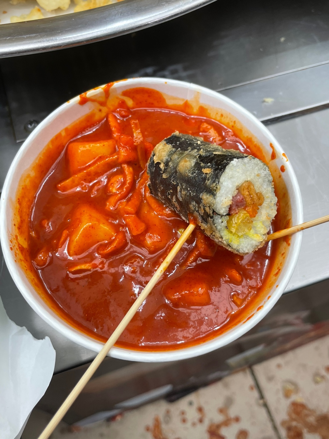 - 떡볶이 & 김밥튀김: 이야.. 이거 무떡볶이라고해서 뭐지 했는데, 물을 전혀 안쓰고 무 로만 만들었다구 한당. 맛도 아주 쫀득쫜득이고 맵지도 않고, 쫄깃하고, 거기에 김밥튀김은 또 튼실해가지구 아주 맛나게 첫끼를 잘먹었따